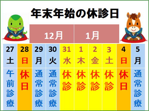 年末年始の診療日をご確認ください。定期処方薬のある方は、